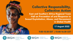 On March 2022, Women in Global Health, with DRC-based CSO ARSF and the African feminist CSO, FEMNET, organized a successful CSO-led  town hall,  attended by representatives from World Health Organization, United Nations and other stakeholders. One of the recommendations highlighted was the need for regional town hall meetings and conversations with regional multilaterals and civil society organizations for in-depth engagement and collaborative work. Therefore, Women in Global Health is now hosting, in partnership with other CSOs, four regional town halls in selected regions where there are high numbers of humanitarian emergencies that expose communities to sexual abuse and harassment. Town halls will be hosted for East and Southern Africa, Francophone Africa, Southern America and Asia.